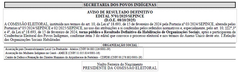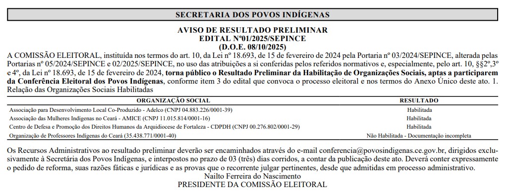A Comissão Eleitoral da Secretaria dos Povos Indígenas do Ceará (Sepince) anunciou a convocação das eleições que irão escolher os representantes indígenas, suplentes e organizações sociais que comporão o Conselho Estadual dos Povos Indígenas (CEPIN) no biênio 2026-2027.